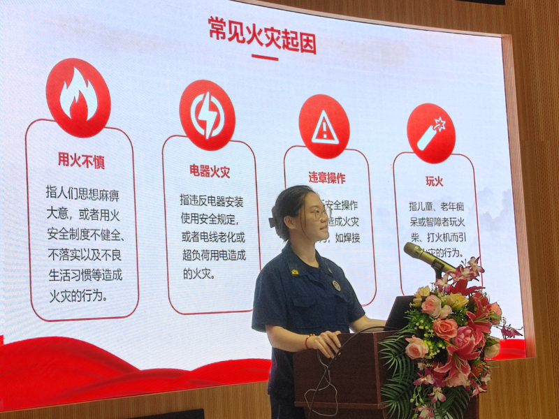 何炜洁专家以“杜绝火灾事故发生,确保人身财产安全”为目标,分别从消防基本知识、发生火灾时怎么办、消防器材使用方法、常见火灾预防等四个部分介绍讲解。