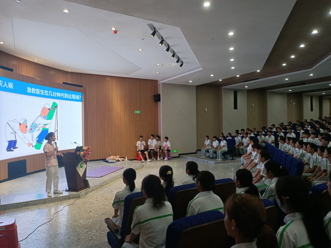 首先,黄金凤老师从身边突发事件、意外事件入手,导入本次的急救培训内容。她列举了2021年上半年广东省大中小学和社会公共场所发生的溺水、触电、气道异物、心搏骤停、中暑等意外伤亡事件,场面触目惊心,让人扼腕叹息。黄老师说,假如事发现场有人懂得急救,很多鲜活的生命可以获救;同时,让同学们明确本次培训学习的目的和意义,通过学习急救技能让大家学会用最简单有效的方法救自己,救他人。