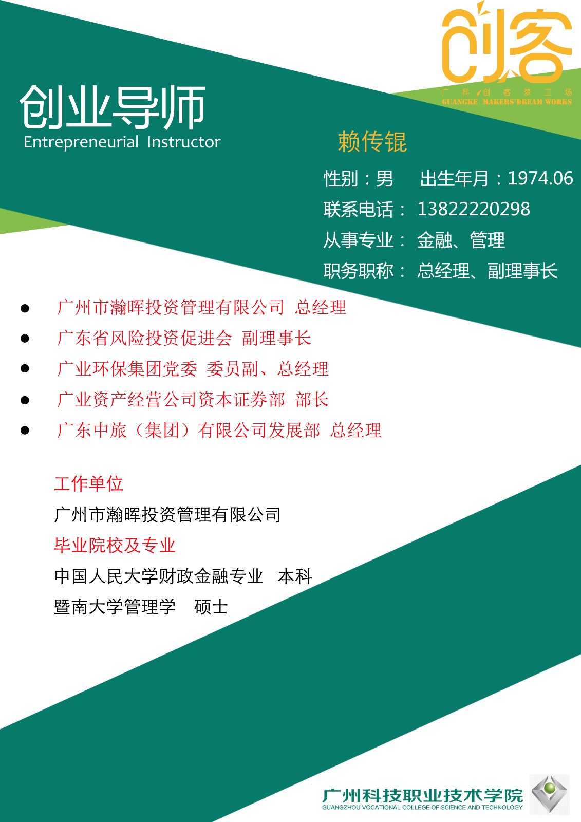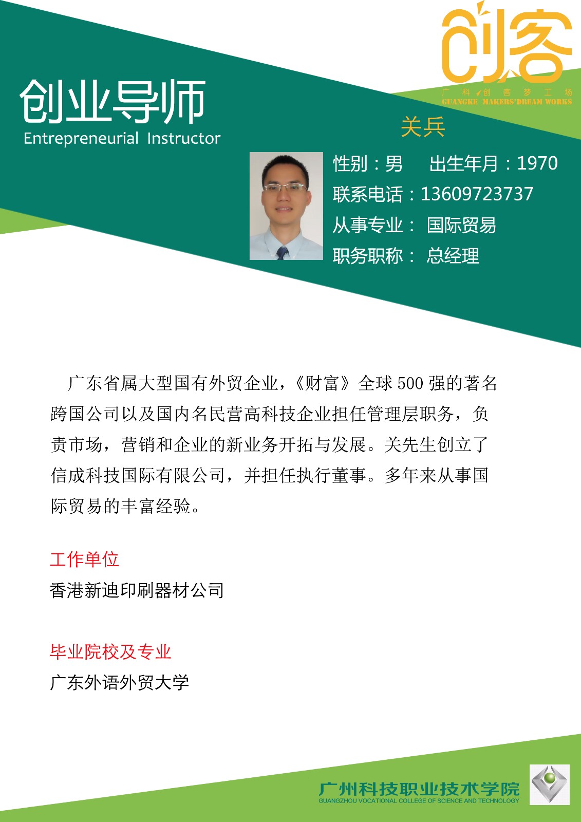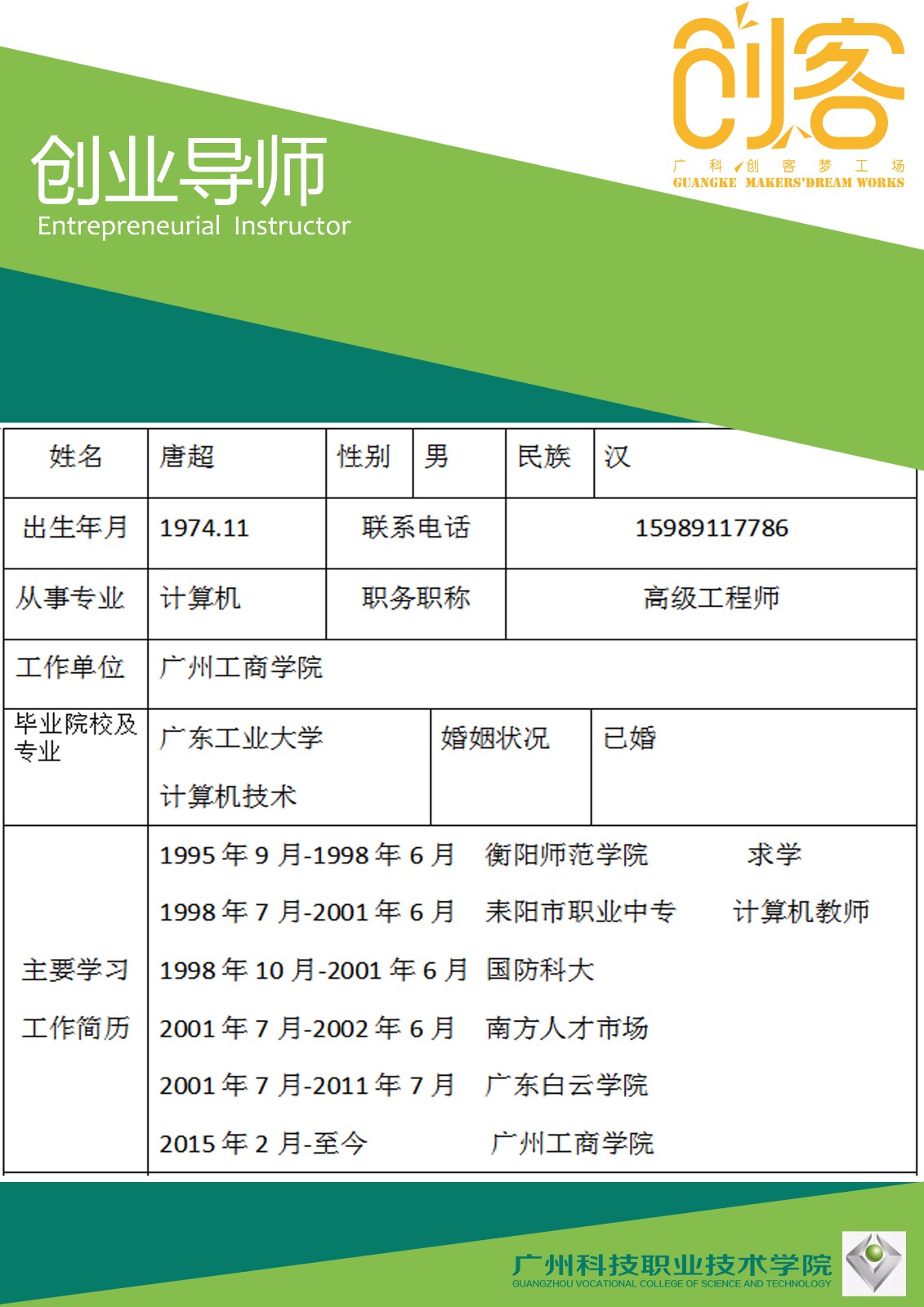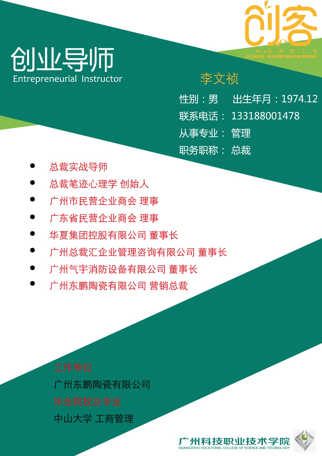 广科创客梦工场建立了一支有23位高素质、多元化的创业导师队伍,为创业者提供创业培训、创业辅导、创投对接等服务,鼓励创业导师与被被辅导企业形成投资关系,建立与创业导师共赢机制。部分导师简介如下:
