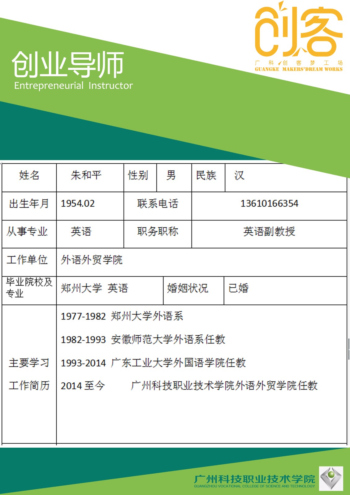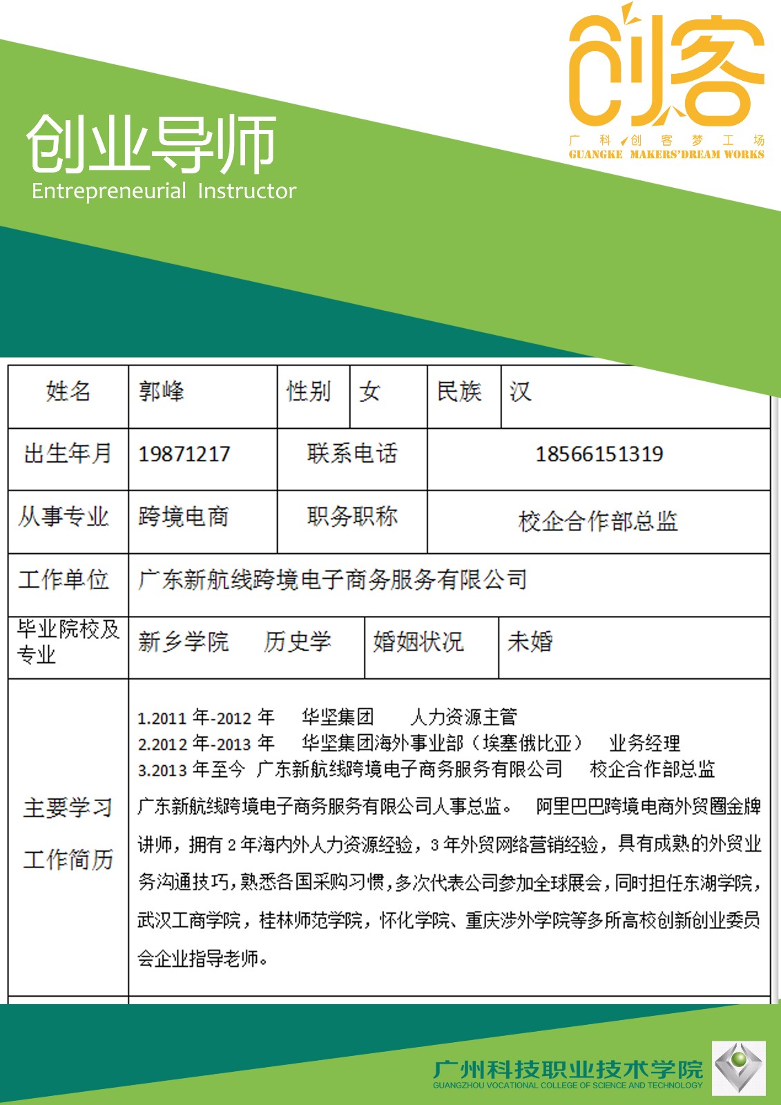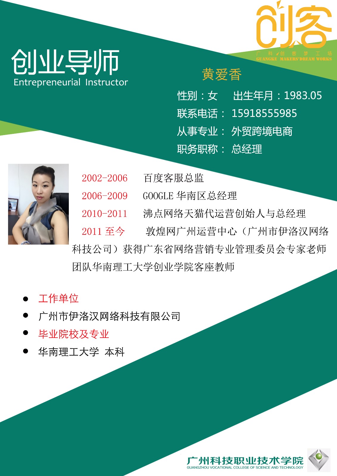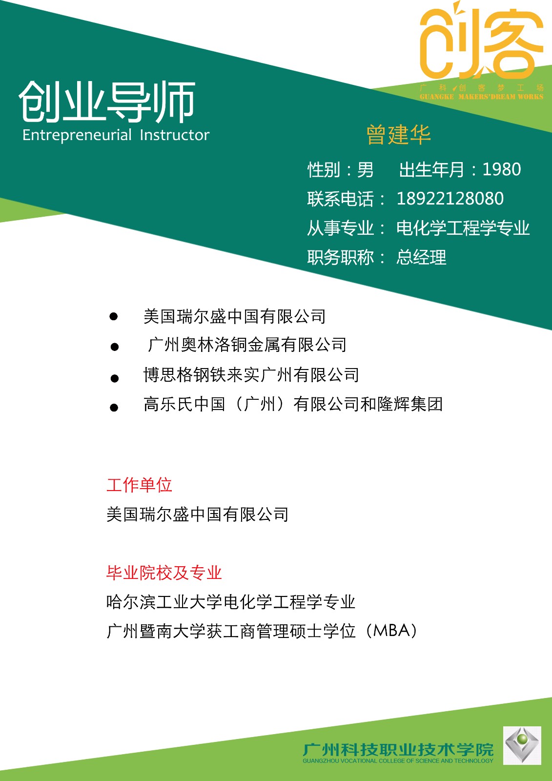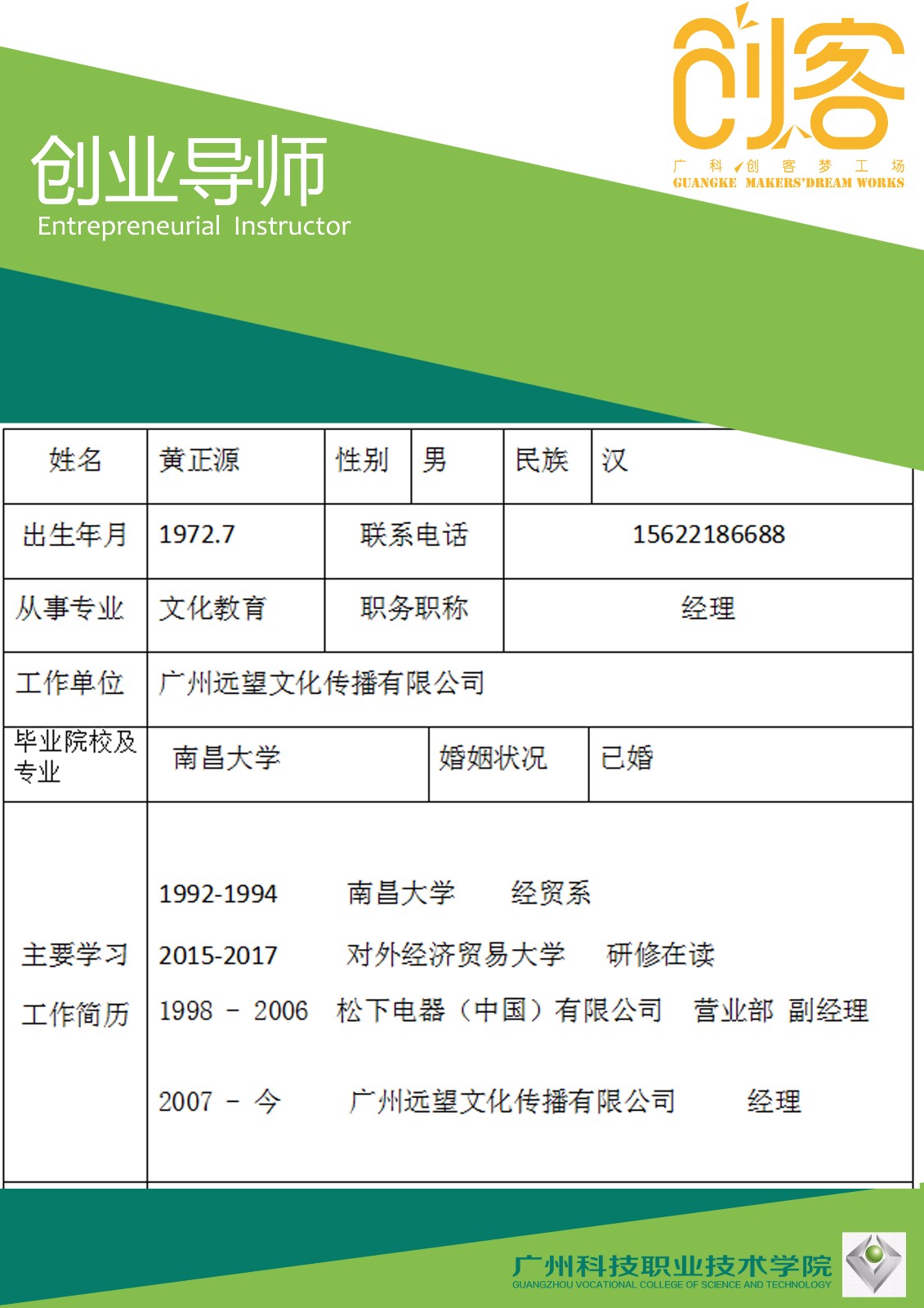广科创客梦工场建立了一支有23位高素质、多元化的创业导师队伍,为创业者提供创业培训、创业辅导、创投对接等服务,鼓励创业导师与被被辅导企业形成投资关系,建立与创业导师共赢机制。部分导师简介如下: