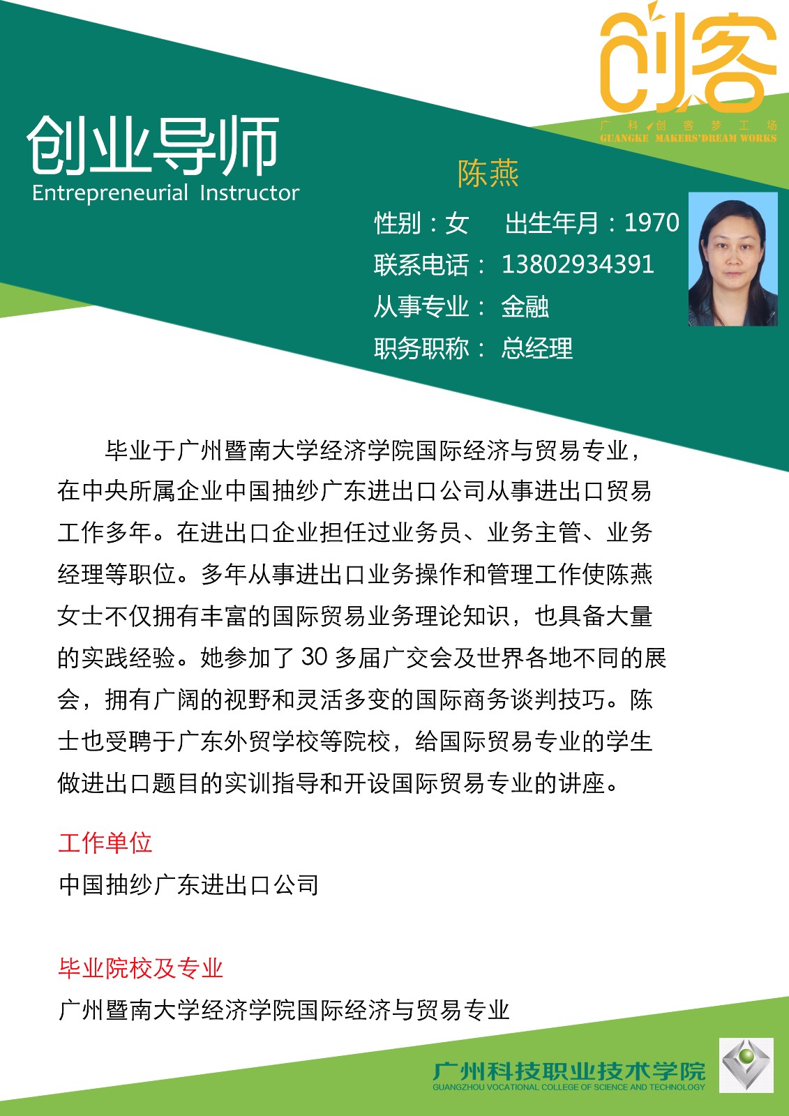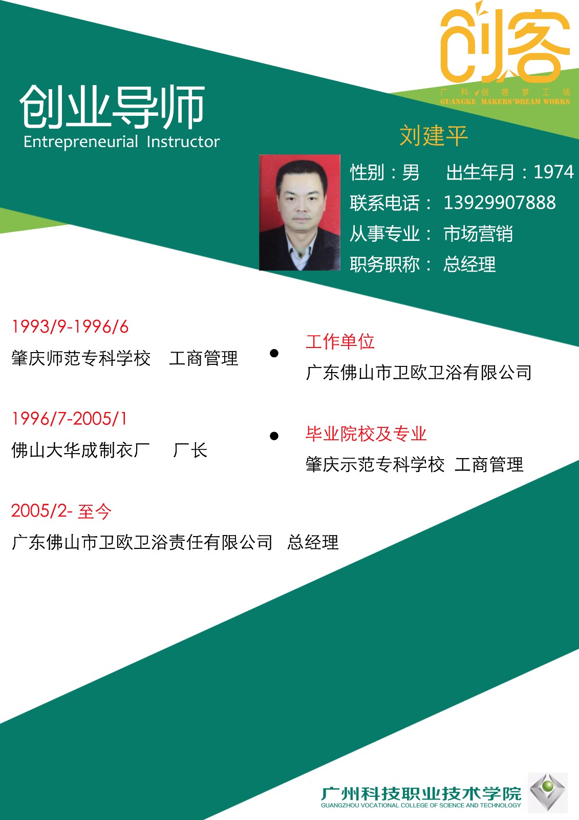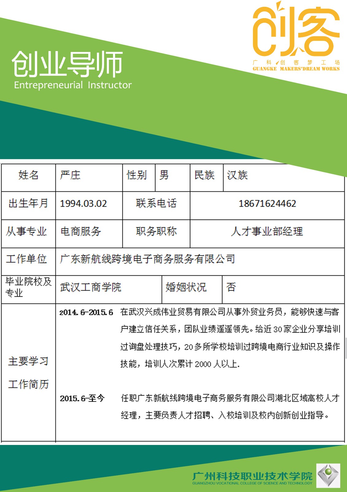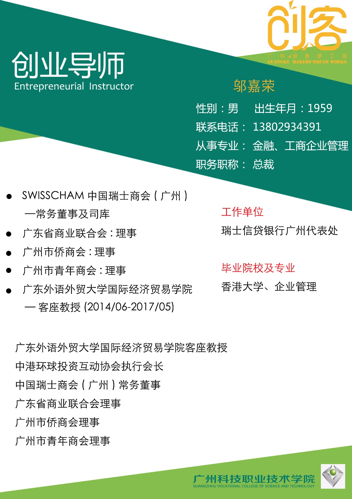 广科创客梦工场建立了一支有23位高素质、多元化的创业导师队伍,为创业者提供创业培训、创业辅导、创投对接等服务,鼓励创业导师与被被辅导企业形成投资关系,建立与创业导师共赢机制。部分导师简介如下: