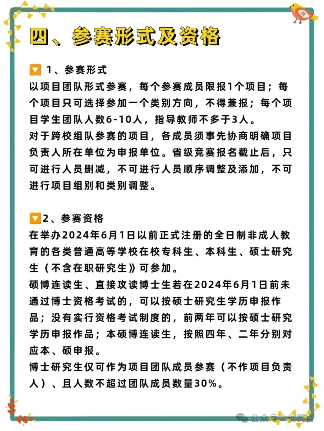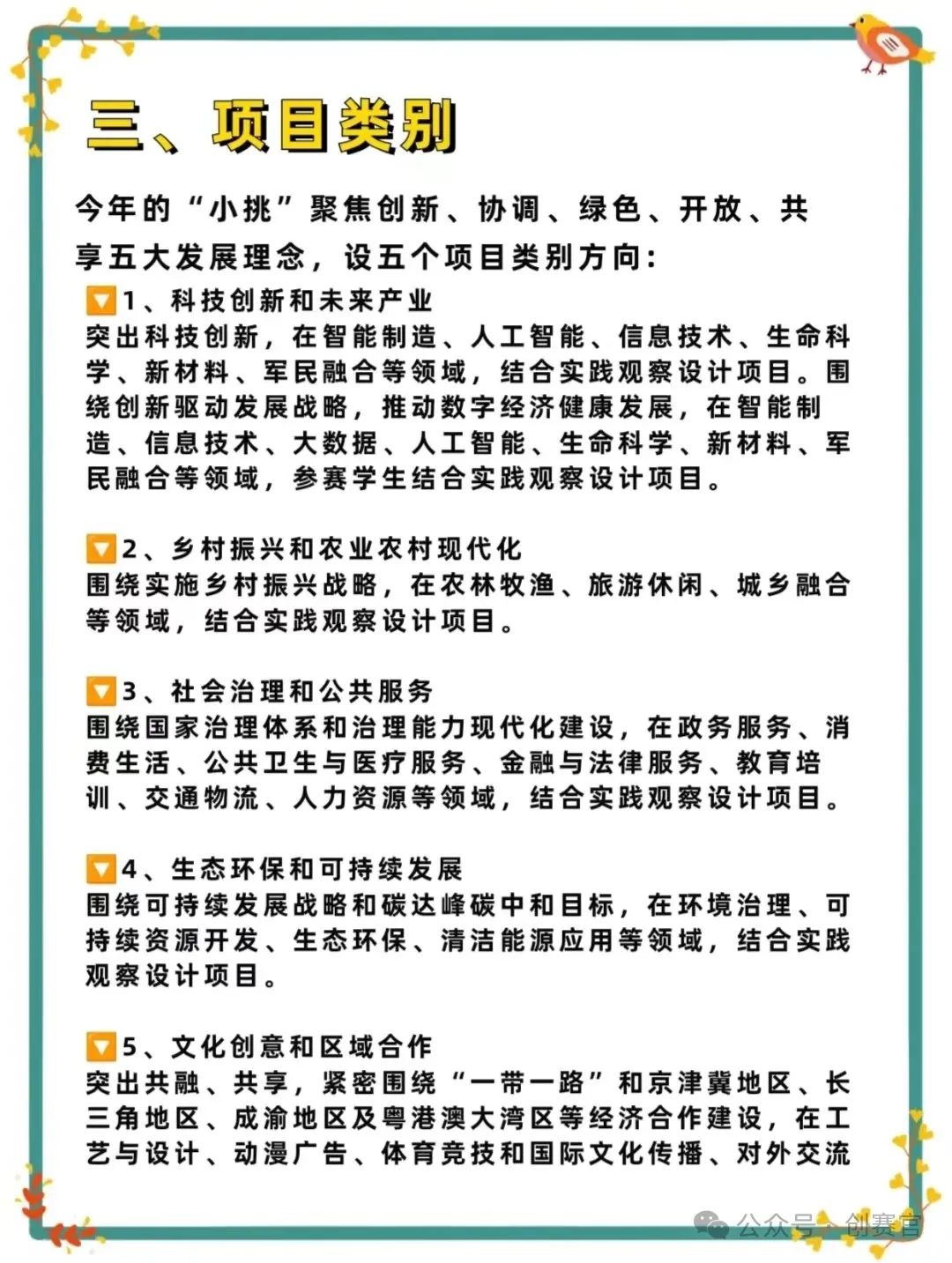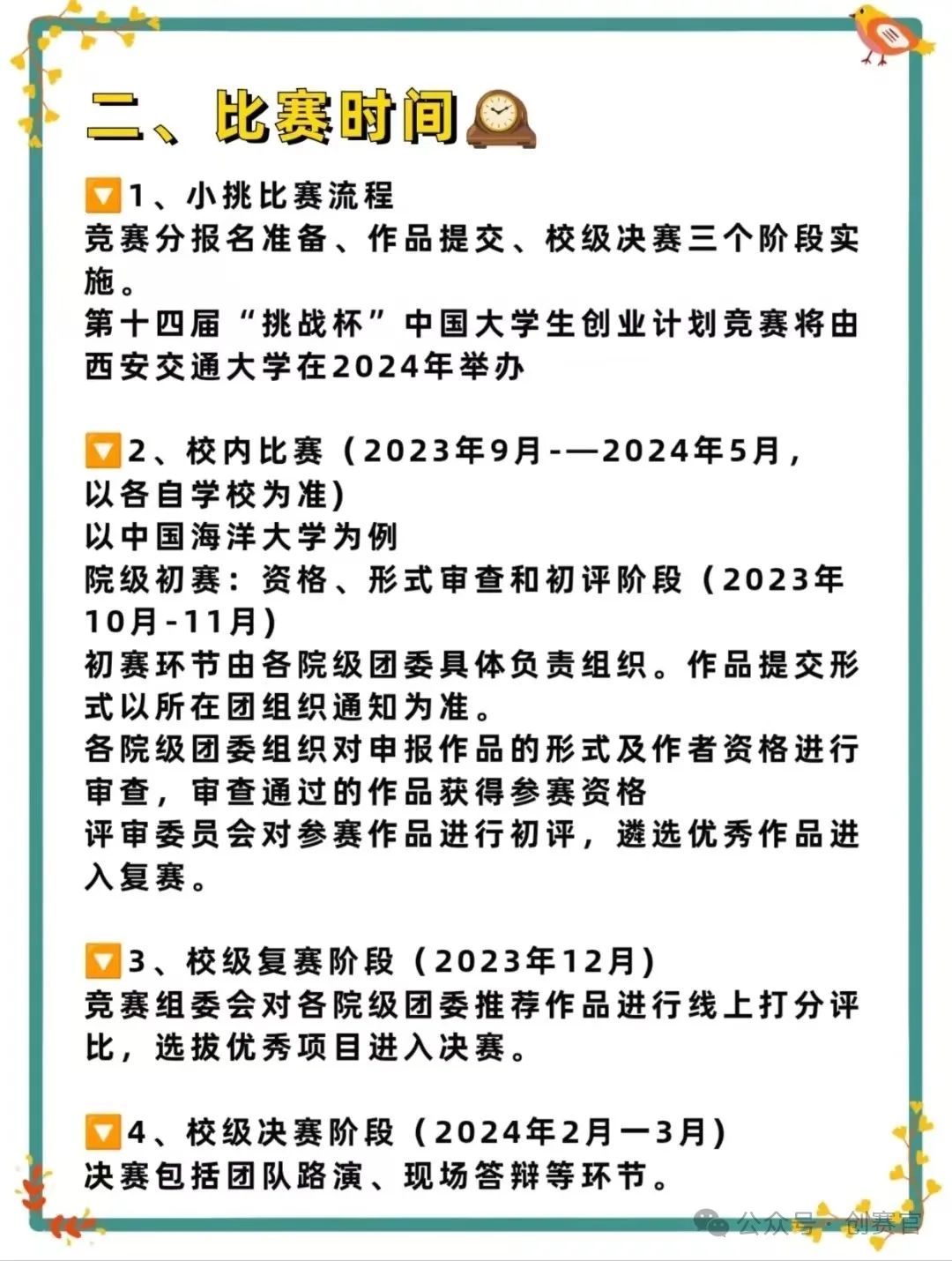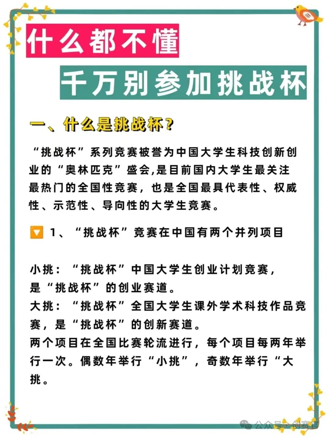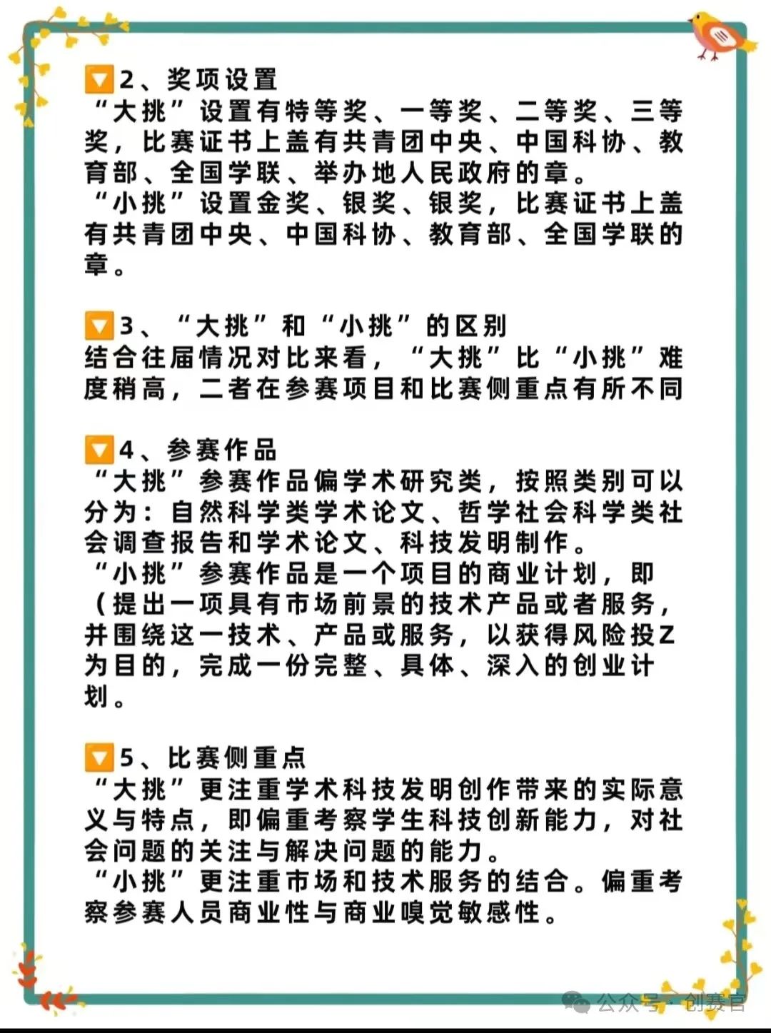 "挑战杯"的比赛形式有“大挑”和“小挑”,偶数年为“小挑”,奇数年为“大挑”,因此2024年是“小挑”年,比赛一般每两年举办一次。“大挑”的全名是“挑战杯”全国大学生课外学术科技作品竞赛,而“小挑”是“挑战杯”中国大学生创业计划竞赛,自2015年起它改名为"创青春"全国大学生创业大赛。“大挑”和“小挑”的区别在于它们的难度程度和主题。根据过往的状况,“大挑”的难度似乎要高一些。“大挑”重视的是科技创新能力以及科技创新带来的实际意义和特色。“大挑”中的参赛作品主要分为:自然科学类学术论文、哲学社会科学类社会调查报告和学术论文、科技发明制作。而“小挑”则更加重视市场和技术服务的结合。也就是说,“小挑”更像是一个“商业计划竞赛”。参赛者需要提出一个有市场前景的技术、产品或服务,并围绕这个技术、产品或服务,制定出一份详尽、深入且具体的创业计划,以吸引风险资本的投资。