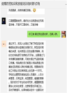 有的老师讲到,通过这次防疫知识的培训学习,我们认识了更多新冠肺炎病毒的知识,也学习了更多防护知识。作为一名中国公民,我们要相信党和政府坚决遏制疫情蔓延势头的决心和能力,听从安排,不给国家添乱;作为一名人民教师,我们要积极响应“停课不停学”的要求,认真做好网络教学工作,关爱学生,传播正确的抗疫思想和方法,引导学生做好疫情防控。