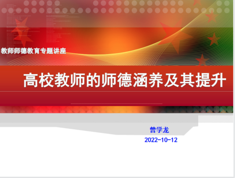 曾教授提出所谓师德,核心要素是“敬业、爱心、正气、学识”。作为教师,当遵守《新时代高校教师职业行为十项准则》,以全国劳模张桂梅老师为榜样,作“有理想信念、有仁爱之心、有道德情操和有扎实学识”的新时代教师。工作中,警惕“精神疲软”,从下课时关闭教室电器的小事开始,尽到教师在工作上的责任心,积极交流学习,动脑筋优化课堂内容,突破墨守陈规的精神懈怠,端正学习态度、潜心学术,研究学生、爱护学生,做到“”一言、一行、一举、一动,都要修养到不愧为人之师表的地步“。教育的本质是爱,要将”爱“贯彻到教育全过程中,在师德的三层境界中逐步提升,以”你影响了多少学生“为评价成就的标准,努力教书育人。