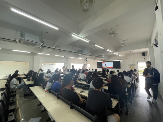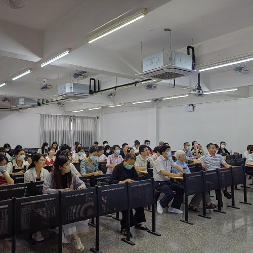 图为工商企业管理专业群师生联合党支部章冠球同志开展讲座