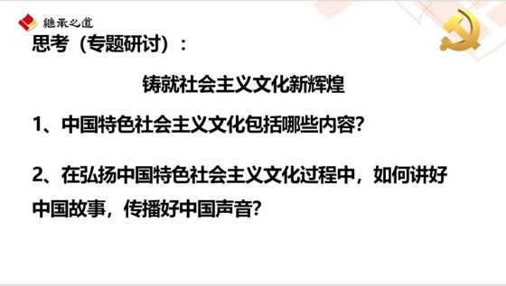 交流互动环节,党员们各抒己见,中国特色社会主义文化的核心是马克思主义中国化,这是因为马克思主义是中国特色社会主义的理论基础。中国特色社会主义文化强调社会主义精神文明建设,这包括文化自信、价值观念、道德风尚、精神风貌等。中国特色社会主义文化的发展推动着中华文明的创新发展,这体现在教育、科技、文艺等领域。中国特色社会主义文化也意味着多元文化的融合,这包括国内外文化的交流、吸收和创新。在弘扬中国特色社会主义文化过程中,应该要增强文化自信。重视民族文化,才能为讲好中国故事提供源头活水。同时,要重视文化的传承和创新,为传递好中国声音提供有力保障。推进国际传播能力建设。加强对国际传播的研究和探讨。推动国际传播能力建设,通过媒体、文化、教育等渠道,在海外传播好中国声音,讲好中国故事。建设具有国际视野和国际影响力的新型媒体平台,并优化其在国际舆论中的地位和作用。加强对外交流。通过富有特色的文化活动和交流项目,理性回应国际社会的关切和疑虑,提升中国形象和实力。在推进文化自信自强,铸就社会主义文化新辉煌的研讨会上,我们深刻认识到文化自信对于国家和民族的发展至关重要。文化是一个民族的灵魂,文化自信是一个国家和民族的精神力量,只有具备了强大的文化自信,才能真正实现"四个自信"。