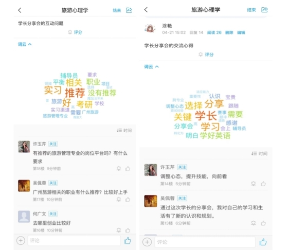 交流互动环节中,同学们热情高涨,纷纷就自己关切的问题踊跃提问,与三位学长展开热烈讨论。从职业发展的迷茫困惑,到实习生活的细微点滴,从考研复习的高效方法,到职场适应的实用技巧,毕业生们毫无保留,耐心解答每一个问题。与此同时,借助学习通平台,同学们得以突破现场交流的局限,更便捷地分享交流心得,进一步放大了这场经验分享会的价值与影响力。
