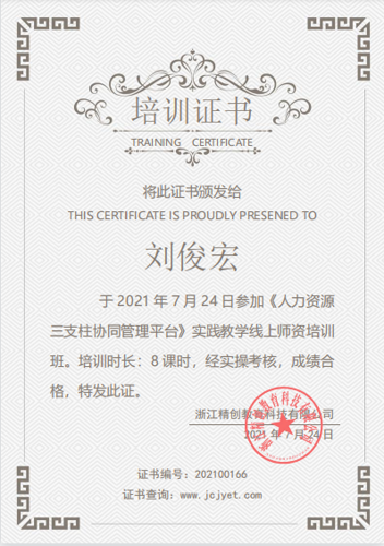 2021年7月24日,学校正值暑假,人力资源管理专业老师利用暑假,积极报名参加“人力资源三支柱协同管理平台”培训,参加培训的老师有刘俊宏老师、刘慧玲老师及钱晓傲老师,他们学习人力资源管理专业最新的三支柱理论及三支柱实践教学方面的知识,为人力资源管理专业人才培养工作打下坚实的基础。