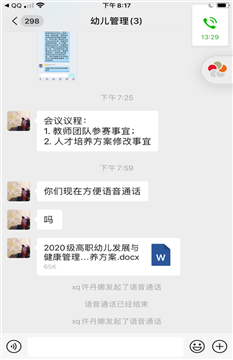 2020年5月21号晚上8点,幼儿教研组在微信群准时开始语音交流会, 会议由许丹娜老师主持。会议议程包括:关于组织开展2020年全省职业院校技能大赛教学能力比赛校内选拔赛的通知的内容讨论、2020级人才培养方案指导意见中需要结合进行适度修改的部分探讨、本学期专业建设的建议。