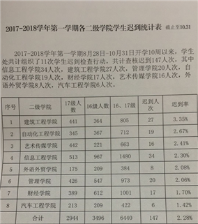 2.迟到率。管理学院本学期1-10周的迟到率为2.06%,在八个二级学院中迟到现象较不严重,曾在第5、6、7周迟到抽查中没有管理学院的学生迟到。但从第8周抽查中有管理学院的学生2名,第11周抽查的最为严重,有9名管理学院的学生迟到,且是17级的学生,相关辅导员已于11月8日中午找学生谈话并写检讨。