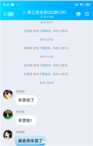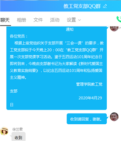 2020年 4月29日,在即将迎来五四运动101周年纪念日之际,管理学院教工党支部利用支部QQ群开展了一次支部书记讲党课的组织生活。本次组织生活的主题是“纪念五四运动101周年,弘扬爱国主义精神”,内容是支部书记谢晓冲利用QQ群课堂为大家解读《新时代爱国主义教育实施纲要》。参加会议的人员不仅包括组织关系在学校的党员,还包括流动党员以及入党积极分子。