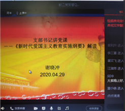 课程开始前谢书记就已经将《新时代爱国主义教育实施纲要》这个文件发布在群里,以方便大家学习。开课前5分钟,由支部宣传委员陆源在QQ群里发起群接龙作为签到方式。课堂开始后,谢书记首先说明了本次课程的内容是他本人学习了中央团校黄亮副教授的课程之后再整理出来的,并非他本人独创的,但加入他本人的一些思考。接着介绍了本次主题党课的主要内容和意义,特别指出,本次主题活动就是要学习《新时代爱国主义教育实施纲要》以纪念五四运动和弘扬爱国主义精神。