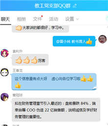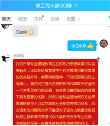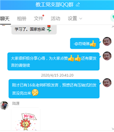 4月15日,正值国家安全教育日,管理学院教工党支部利用支部QQ群顺利开展了4月份的主题党日活动。本次会议的主题是“专业课程教学结合思想政治教育,培养又红又专新时代大学生”。会议的主要内容是围绕专业教学工作和思想政治教育、安全教育相结合的主题,让本学期有授课任务的党员老师就如何在教学工作中增强师生的思想政治素质、安全意识等问题进行讨论交流。会议由支部书记谢晓冲主持。参加会议的人员不仅包括组织关系在学校的党员,还包括流动党员以及一名刚被确定为入党积极分子的教师。