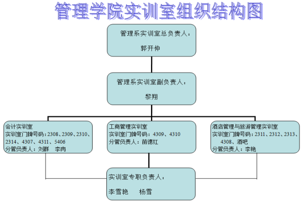 管理学院成立于2009年12月,设有会计学、工商管理、酒店管理与旅游管理3个专业,现有实训室13间,包括:出纳实训室(2308)、沙盘模拟实训室(2309)、ERP实训室(2310)、会计手工实训室(2314)、初级电算化实训室(5406)、金融实训室(4311)、收银员实训室(4307)、西餐实训室(2311)、客房管理实训室(2312)、中餐实训室(2313)、茶艺实训室(4308)、酒吧实训室、商务谈判综合实训室(4309-4310)。占地面积约1233.78平方米。