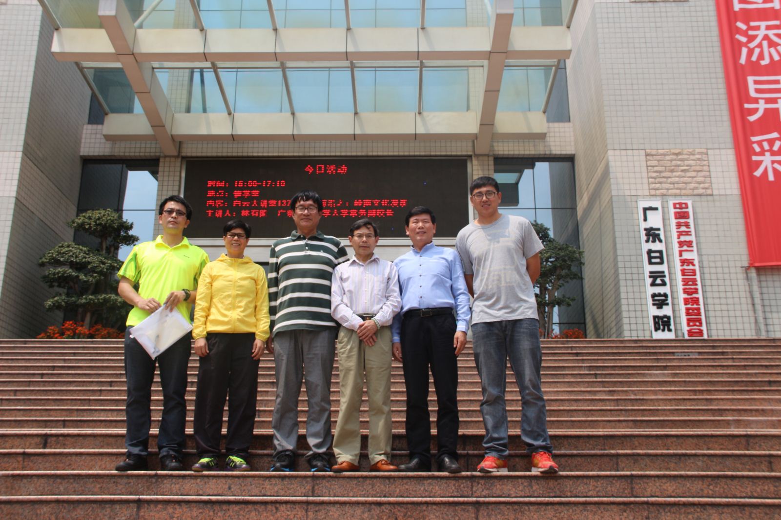 (广科新闻网讯)3月7日,我校基础部主任孙银光、实习就业处处长潘世华,学校校办副主任叶云峰,体育教研室于辉主任一行到广东白云学院交流学习。广东白云学院基础部主任张绪平,体育教研室主任孙细英等热情接待了我院一行.