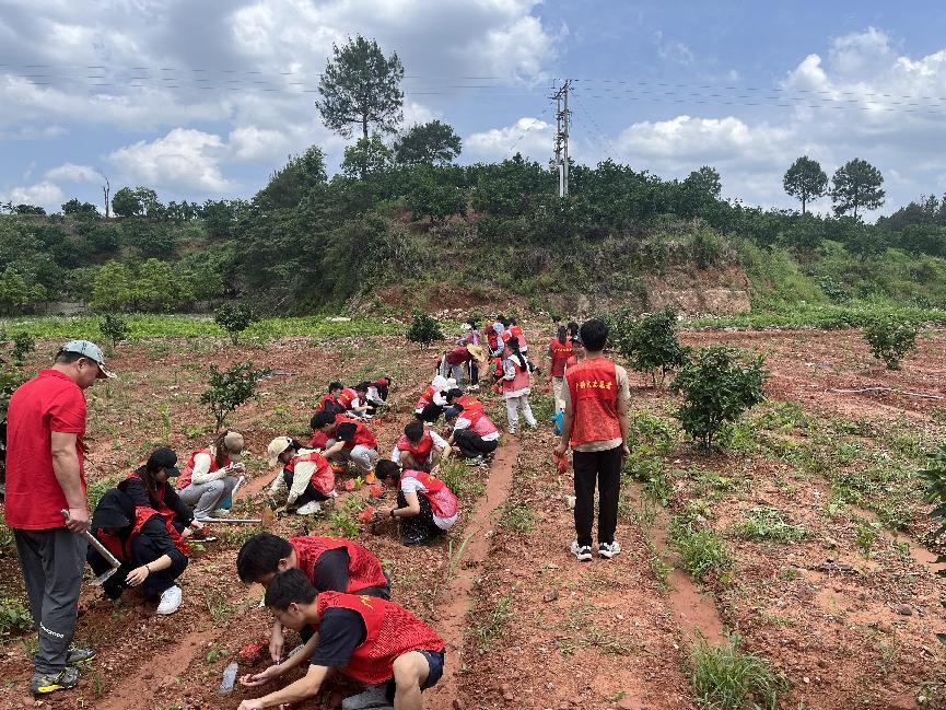 理论学习结束后,同学们迅速投入到紧张而有序的实践环节。49名同学被分成5个小组,其中第1、2、3组各领取一种中草药,分别前往韶关中草药基地的14-17号区域进行种植。另外,第4和第5组则负责辅助前三组,承担测量记录、浇水等工作。在种植过程中,同学们分工明确、配合默契。有的同学小心翼翼地将中草药幼苗植入挖好的坑中,有的同学仔细测量植株间距并认真记录数据,还有的同学提着水桶为新种的幼苗浇上“生命之水”。尽管天气有些炎热,但同学们的热情丝毫不减,大家都沉浸在亲手种植中草药的喜悦与成就感之中。