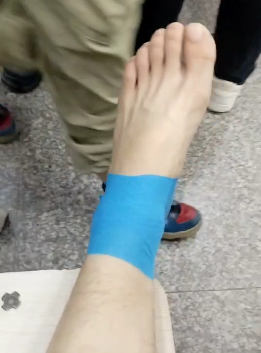 本次讲座的核心实践教学环节,罗医生带领同学们深入探索踝关节损伤处理技术,解释了大部分踝关节损伤为外侧韧带损伤的关键原因,随后手持肌贴、弹性绷带、白贴等工具,一边细致讲解材料特性,一边通过给学生示范,将“8字固定法”和肌贴固定的每一个步骤拆解演示,从绷带缠绕的方向、力度,到肌贴剪裁的角度、贴扎位置,每个细节都讲解得通俗易懂。
