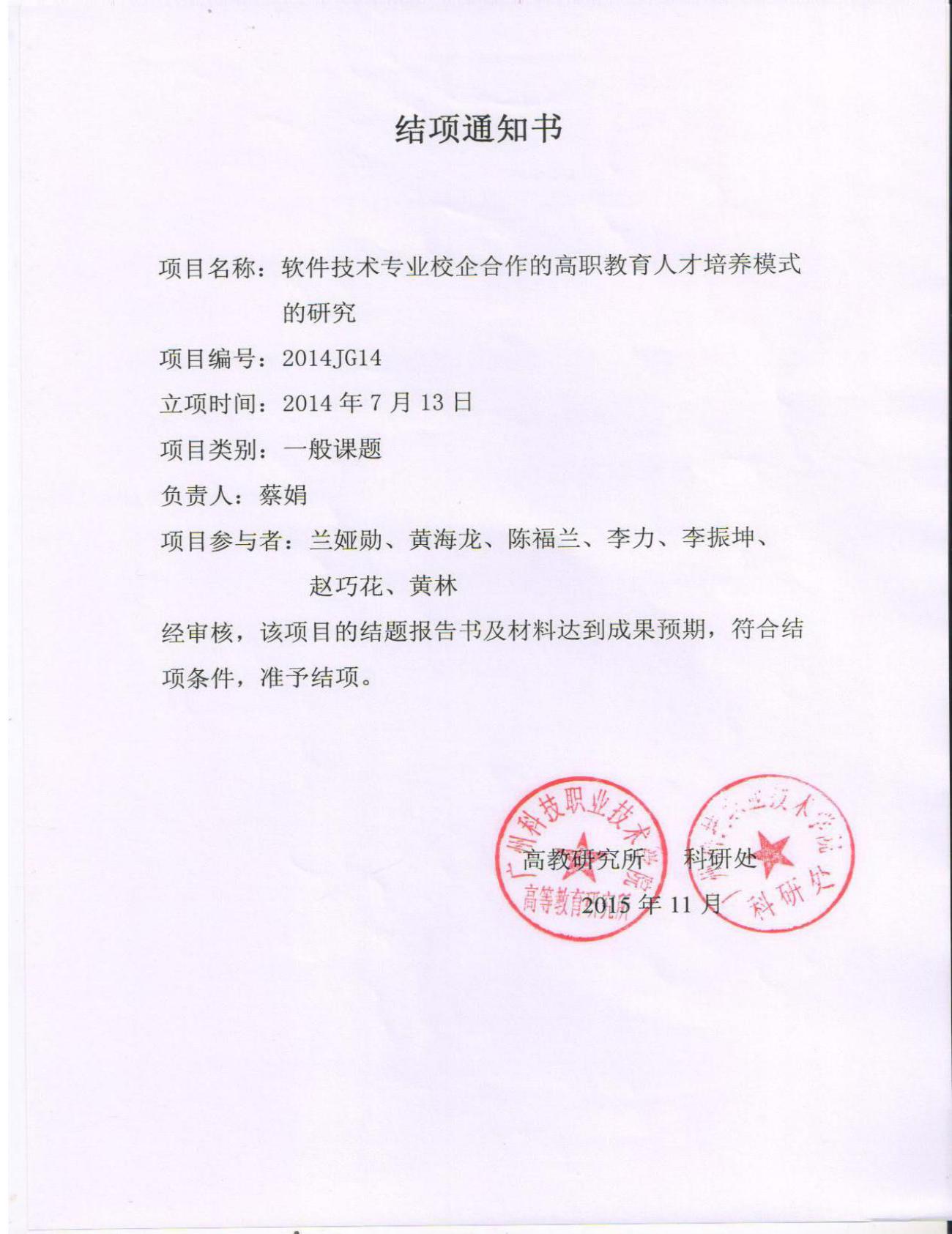 软件技术专业校企合作的高职教育人才培养模式项目的结题通知