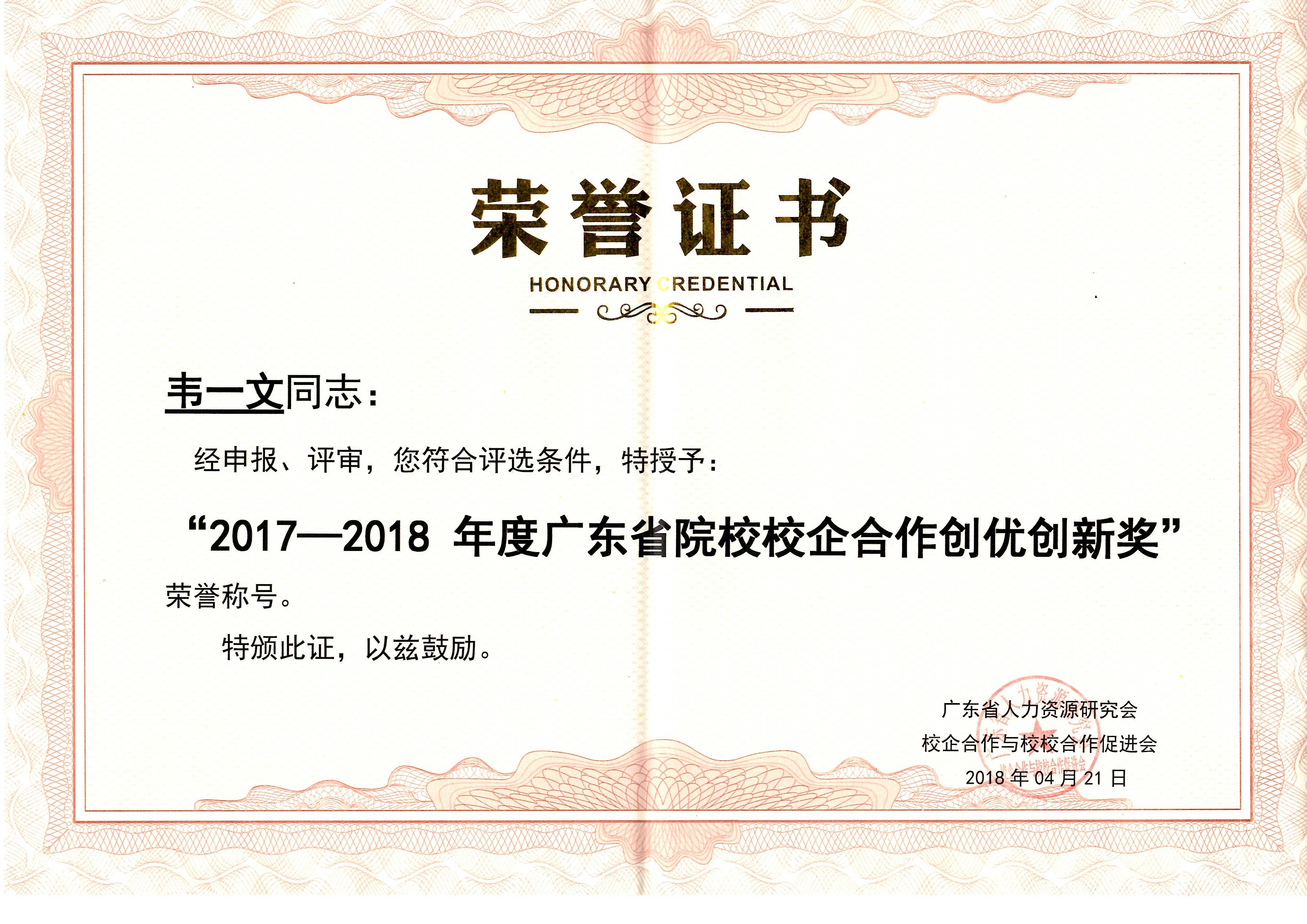 韦一文老师获得2017-2018年度广东省院校校企合作创优创新奖