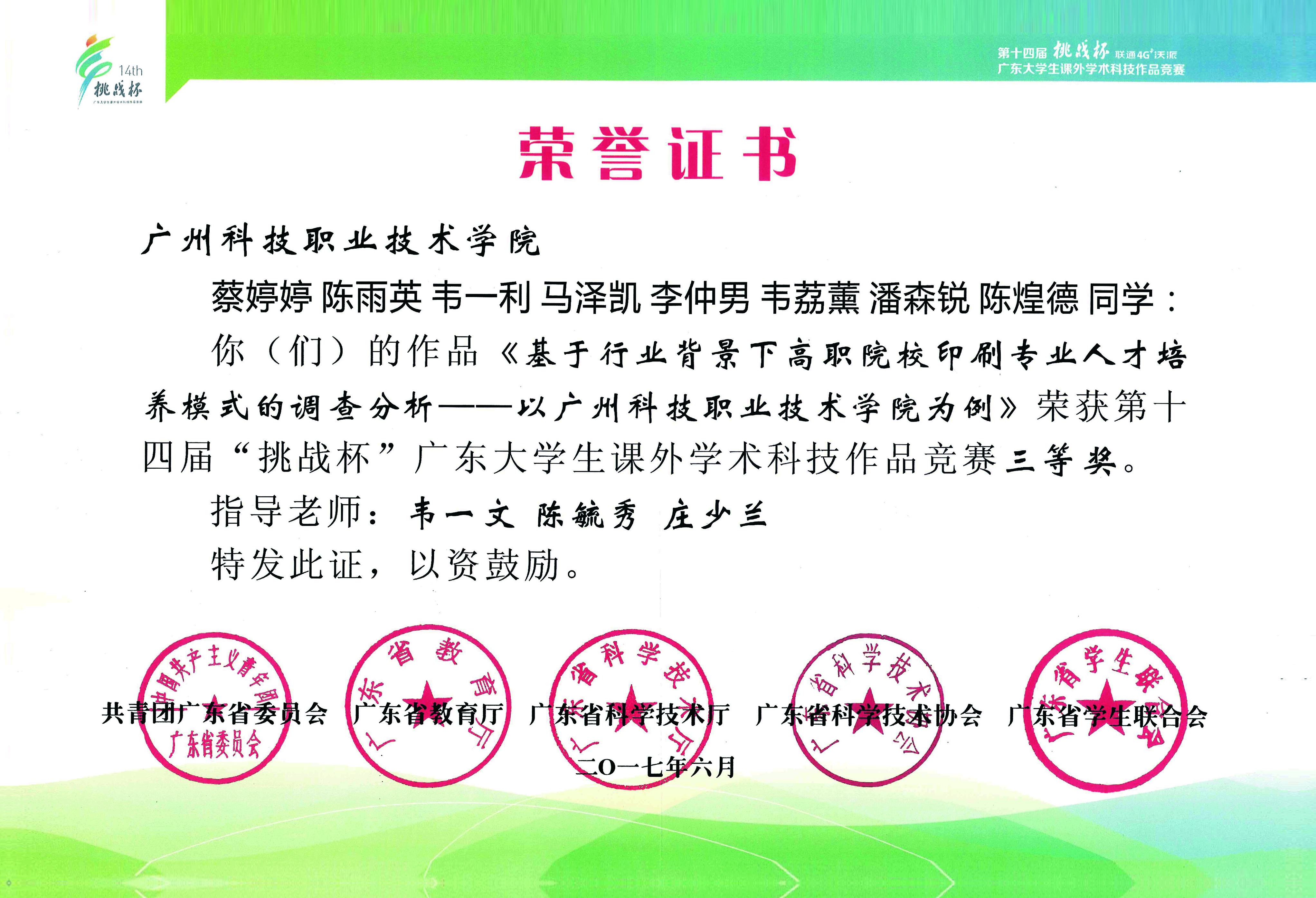 第十四届挑战杯广东大学生课外学术科技作品竞赛三等奖