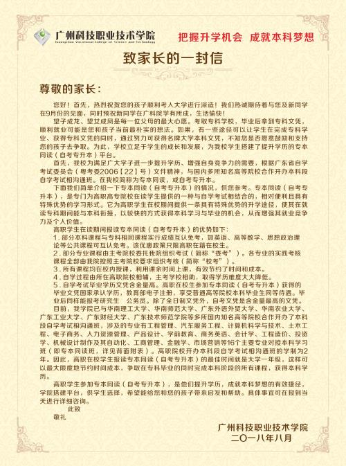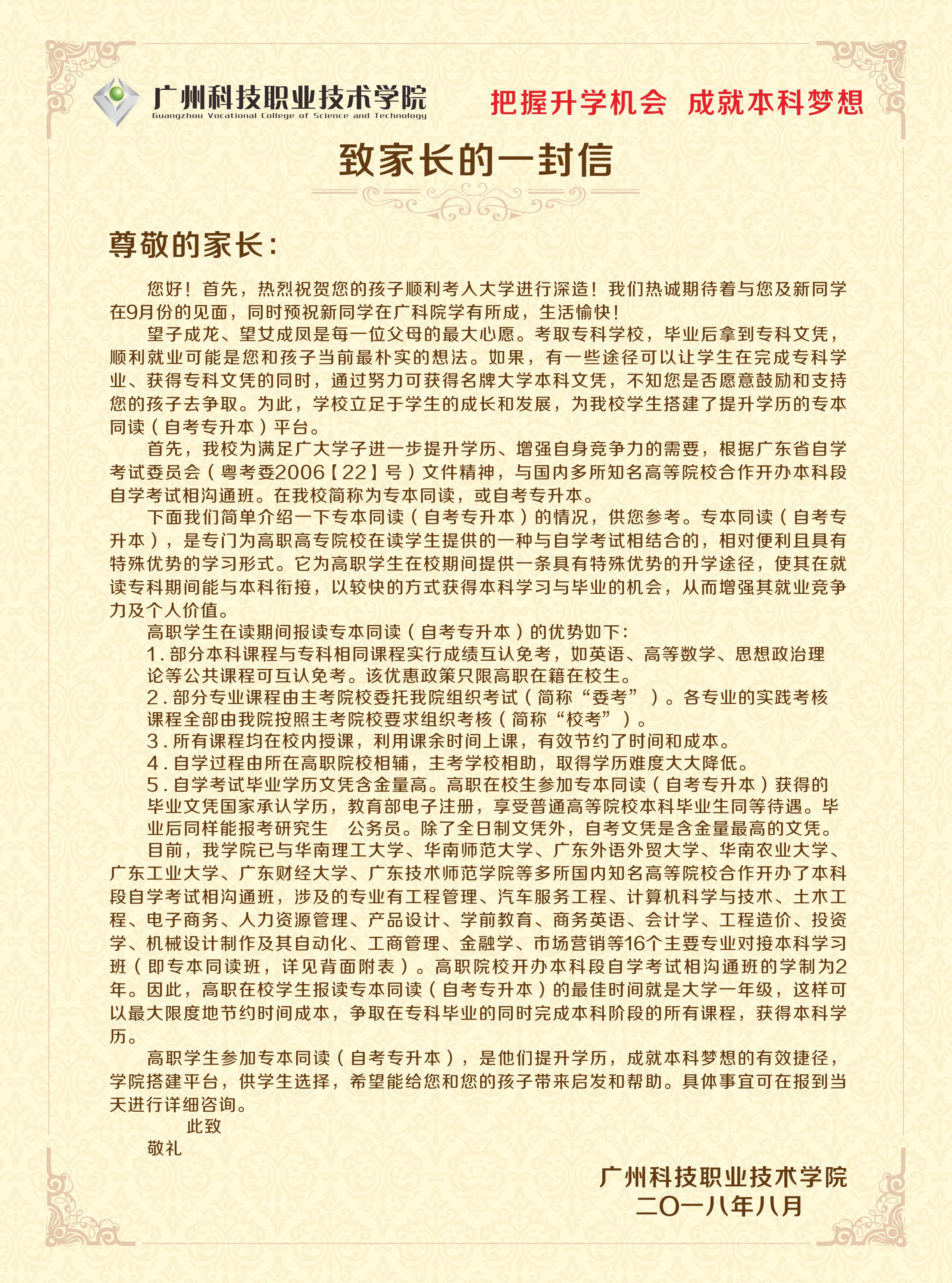 2018年广州科技职业技术学院致家长的一封信--把握升学机会 成就本科梦想