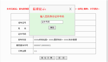 考生要再次核对个人身份信息、报考科目是否与个人所选一致、订单金额是否有误,若无误,点击“前往缴费”按钮(见图5),并在弹出的身份确认信息框(温馨提示),请输入考生在广东省自学考试管理系统中的考生证件号码(所输入证件号码务必于系统中信息完全一致,见图6)。