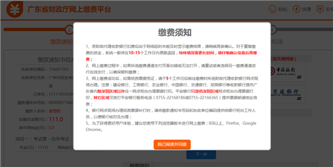 考生确认身份信息后,页面跳转至财厅缴费系统。考生认真阅读缴费须知,并点击“我已阅读并同意”按钮,可进入下一个界面,考生按照界面提示完成缴费(见图7-15)。