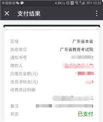• 缴费完成时,“广东省自学考试管理系统”将提示支付结果信息。