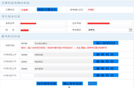 完成缴费后,进入考生报考界面,查看缴费信息。若银行已提示扣款但“缴费状态”为“未交费”,可点击“刷新缴费状态”按钮更新缴费信息(见图16)。