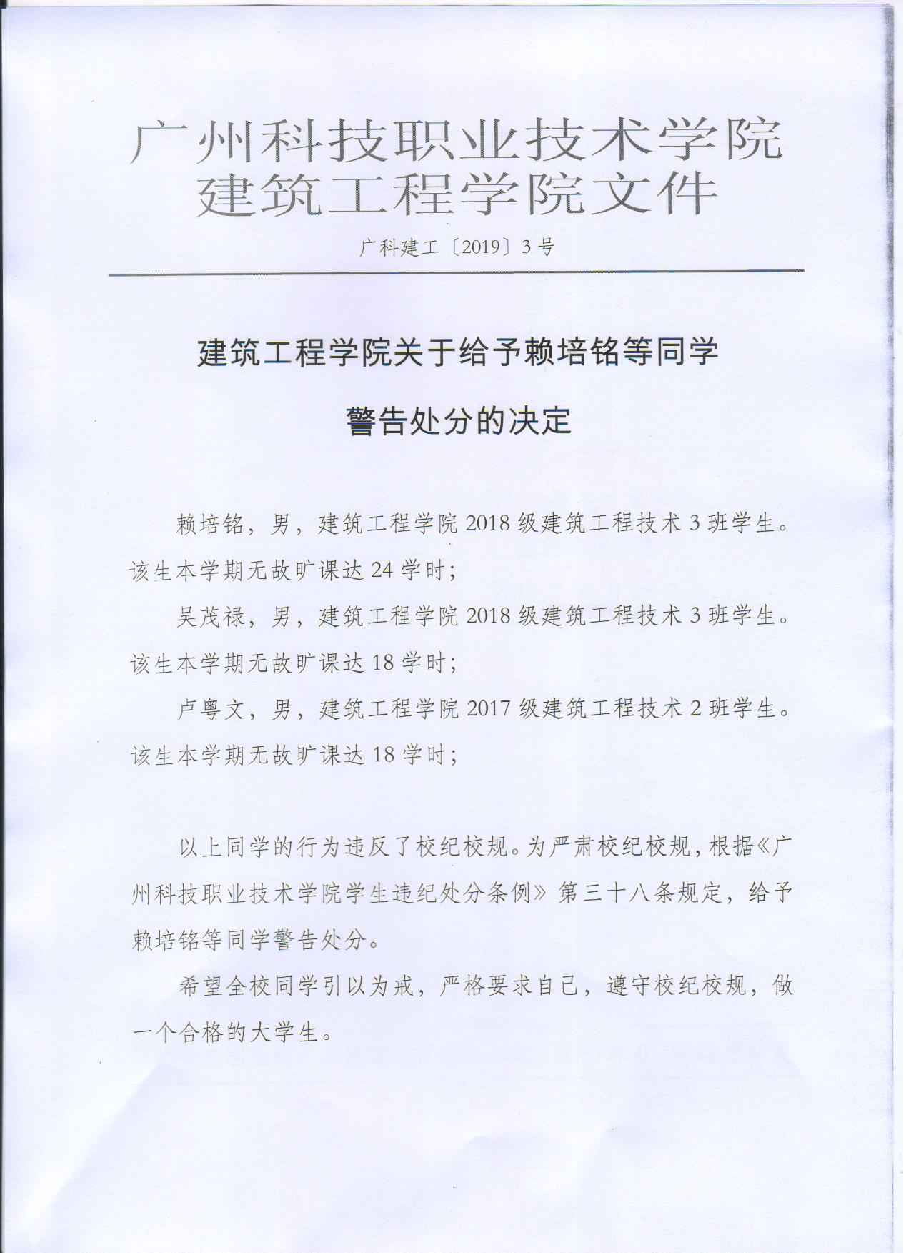建筑工程学院关于给予赖培铭等同学警告处分的决定