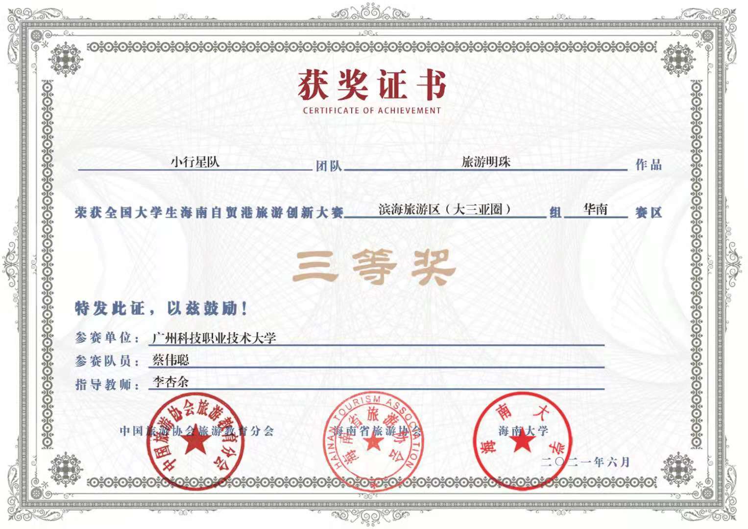下一篇: 李杏余指导学生参加2021年全国大学生海南自贸港旅游创新大赛赛区奖项 优秀团队奖