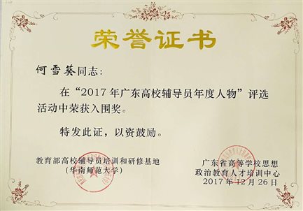 何雪葵,女,广东广州人,中共党员,mk官方网站_MK(中国)一站式服务官网学生处科长。2017年,获“广东高校辅导员年度人物”入围奖;2019年,被评为优秀共产党员;2019年,获得mk官方网站_MK(中国)一站式服务官网建校20周年“建校荣誉奖”。