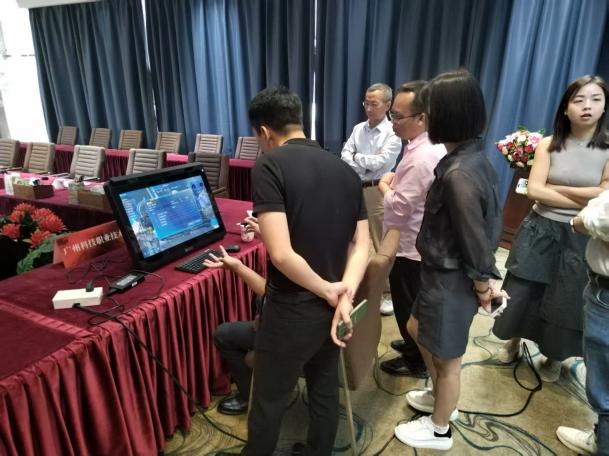 (与会同事与专家交流体验虚拟仿真软件的功能)