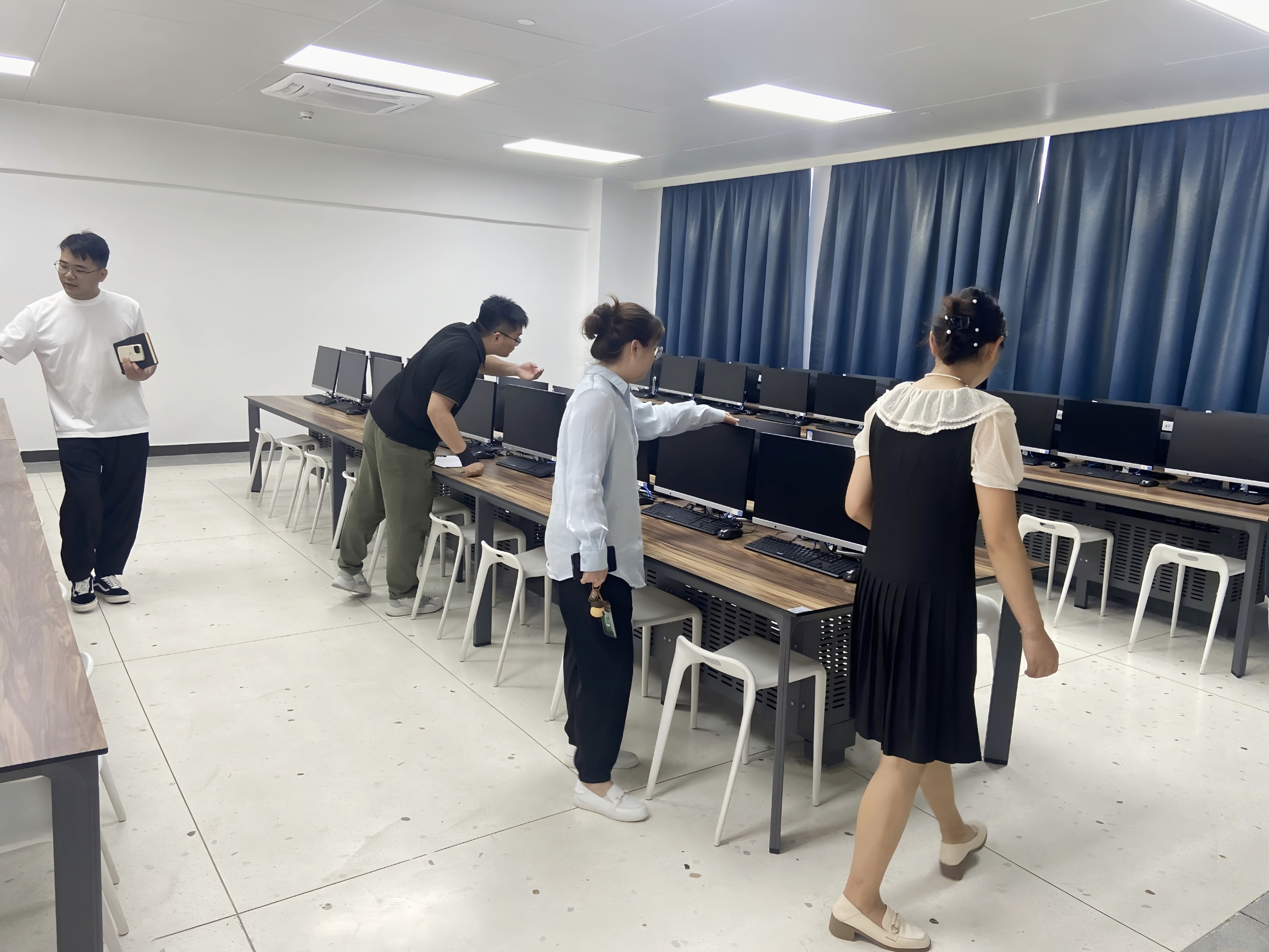 本次检查重点围绕,设备设施归位摆放、环境卫生整洁两大核心内容展开,具体检查对象包括门、窗、讲台、黑板、地面、台面、仪器设备表面及实验用具教具等。通过实地查看、文字记录和拍照备案相结合的方式,逐一对滨海校区9间公共机房、2间语言室、2间电工室、1间礼仪室、1间物流室及1间制图室进行全方位检查。