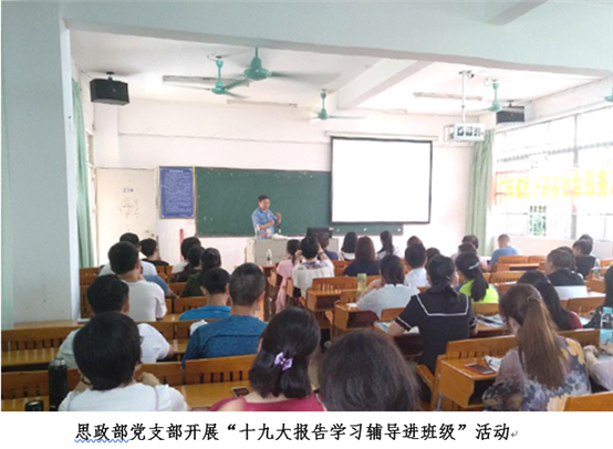在服务学院方面,2017年以来,思政部党支部先后开展了“十九大报告学习辅导进班级、进社区”等活动。从11月22日到29日,支部组织开展了“十九大报告学习辅导进课堂、进头脑”活动,思政部党员谢颖、董英华、周娇和陆祉亦等老师为管理学院等班级宣讲十九大报告,数百多学生参加了学习。从11月10日起到19日,思政部曾学龙教授先后为本校和附近高校的团学干部及黄埔、海珠区的社区党员干部作了4场学习辅导报告。11月19日上午,应广州市黄埔区金峰园社区党支部的邀请,曾学龙教授对金峰园社区党支部的全体党员作了题为“用新思想引领新时代新征程-----学习十九大报告的体会”的专题辅导。同时,思政部党支部还于2017年12月17日组织党员教师参加了“钟落潭地区高校学习贯彻党的十九大精神‘五进’工作研讨会,就如何建设思政课、怎样让十九大走进课堂进行了交流和探讨。