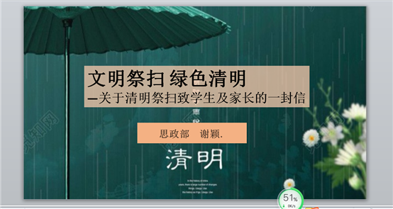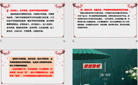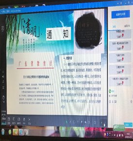 支部党员按照文件要求积极行动、认真落实,以多种方式对学生进行宣传教育。有的思政老师在班级中围绕清明节祭扫展开了学习讨论,有的则通过微信、QQ群、学习通群聊发出通知和倡议,还有的老师专门制作了精美的PPT,在课前进行宣传教育,如王润萍、谢颖、刘晓黎、王素芳等均通过直播教学的方式,以文字和图片晓之以理、动之以情地与学生进行互动交流,在线给学生进行宣传和解说,号召学生及其家长以居家追思、网络祭扫、书写寄语等文明简约的祭扫方式来表达对先辈的怀念和尊重。