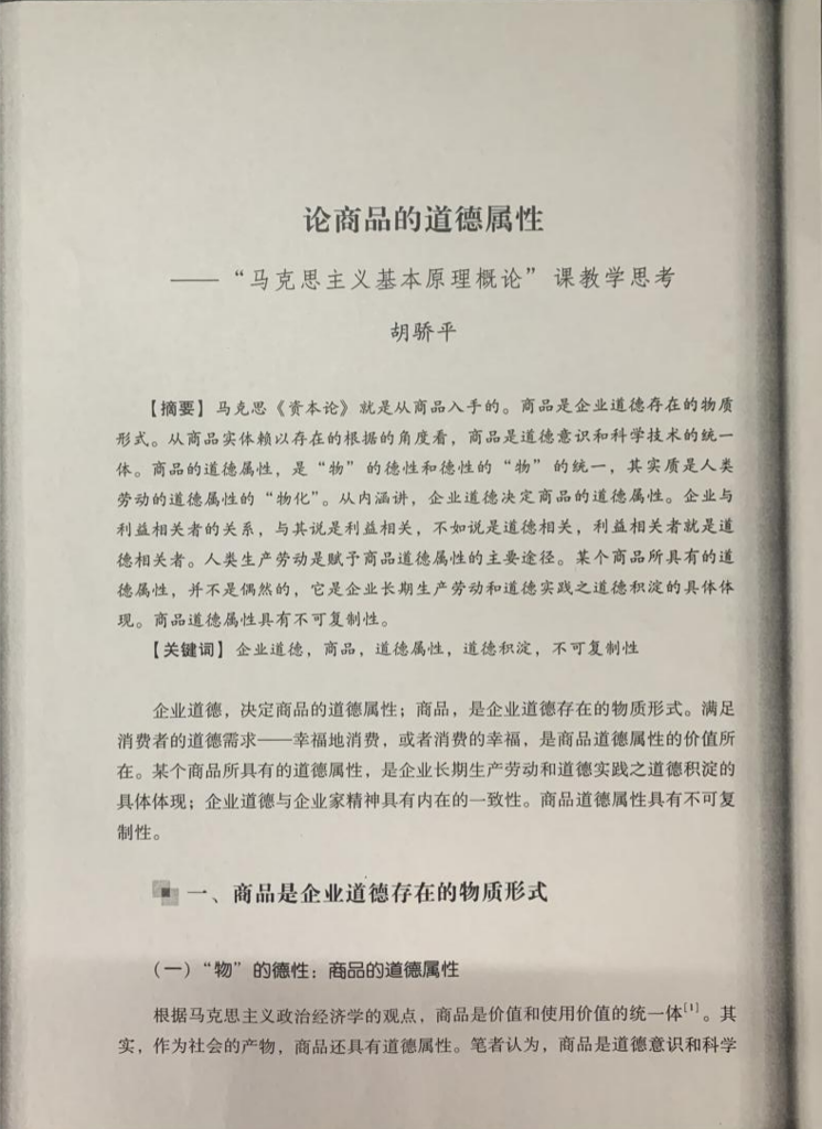 近日,北京理工大学(珠海)马克思主义学院出版教改成果《立德树人,守正创新——北京理工大学珠海学院以“五要件”“八素养”为核心的高校思政课改革探索》专著,胡骄平教授作为该专著编委,发表教改论文《论商品的道德属性——马克思主义基本原理课教学思考》。该文是对马克思主义商品理论的发展,充分体现了马克思主义理论的开放性和与时俱进的理论品质。该文认为: