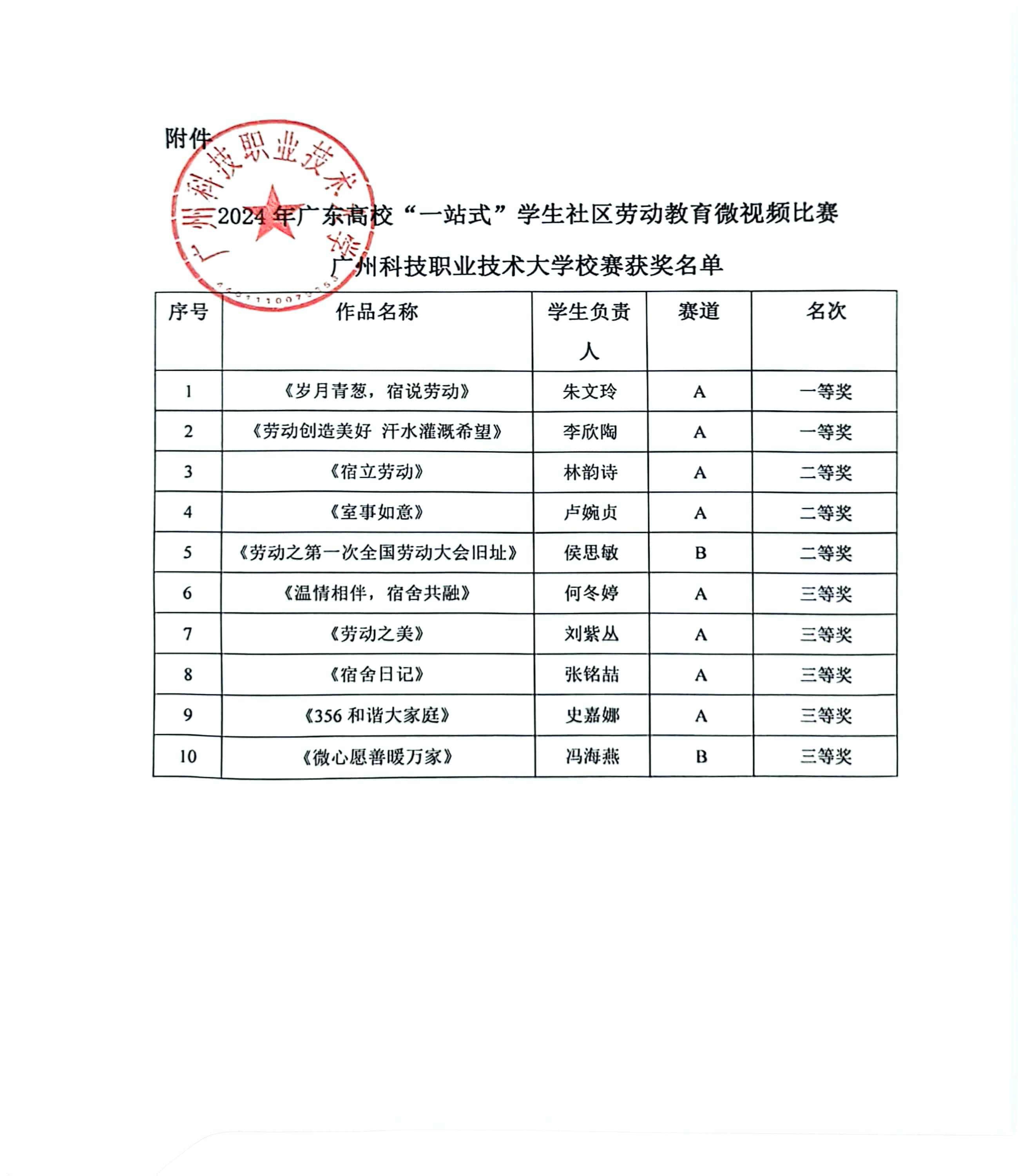 2024年广东高校“一站式”学生社区劳动教育微视频比赛广州科技职业技 术大学校赛已经顺利结束。本次校赛共收赛道A的作品42份,赛道B的作品5 份。根据广东高校“一站式”学生社区劳动教育微视频比赛通知要求,各学校可 上报10份作品。经过评委评选,共评出一等奖2名、二等奖3名、三等奖5名。 此校赛获奖的10份作品将按照广东高校网络思政工作中心的要求以学校为单位统一申报省赛,详细名单如下。