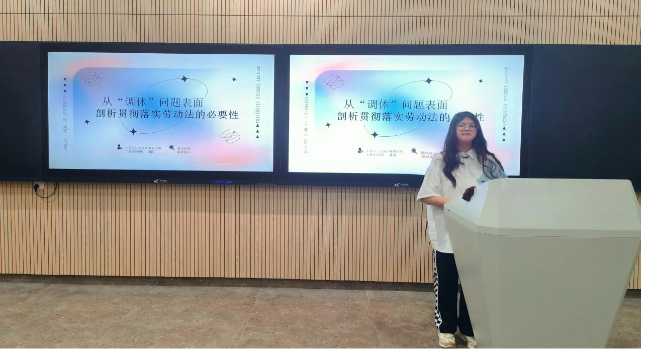 同时,从当下的社会经济形势这方面为出发点,讲述了我国社会竞争激烈,就业岗位的减少,就业压力的增大等现象的出现。主讲人葛阳同学用“内卷”这一网络热词形象的概括了现如今这种不合理的工作制度给劳动者产生的负面影响。之后为同学们播放员工向领导讨要加班费被拒的视频,以此为例子,反映了如今仍有着诸如拖欠工资等违背劳动法规定的情况存在,更进一步地强调了贯彻落实劳动法的必要性。