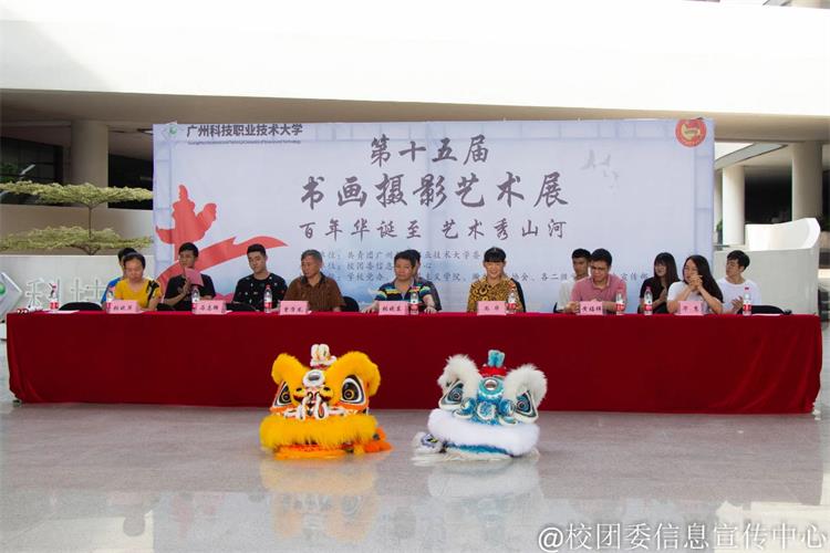 12日下午14:30分,书画摄影艺术展开幕式正式开始,开幕式邀请了马克思主义学院院长曾学龙、自动化学院院长张晓东、艺术传媒学院院长尚华、学生处副处长黄福祥、艺术团团长马志辉、党办老师张晓萍、团委老师华慧以及各学生组织代表。开幕式由校团委广播站林运生和康博雅主持。首先由广科大龙狮团带来《双狮报喜》,为活动增添了喜庆、欢乐的氛围,龙狮团各拿起一副书法,两幅书画上写着十个大字:“百年华诞至,艺术绣山河。”以青春的名义,展现青春的风采,深入弘扬中华民族传统文化,增进绘画艺术交流。接下来由瀚麟书画协会与茶道协会共同表演《墨砚茗茶》,同学们都沉浸于自己的表演中,场上弥漫着浓浓的书香气息,用心书写每一个笔画、每一个汉字,尽其所能的展示自身书法的才能。用墨香的味道装扮了校园,也进一步宣传了书法艺术。