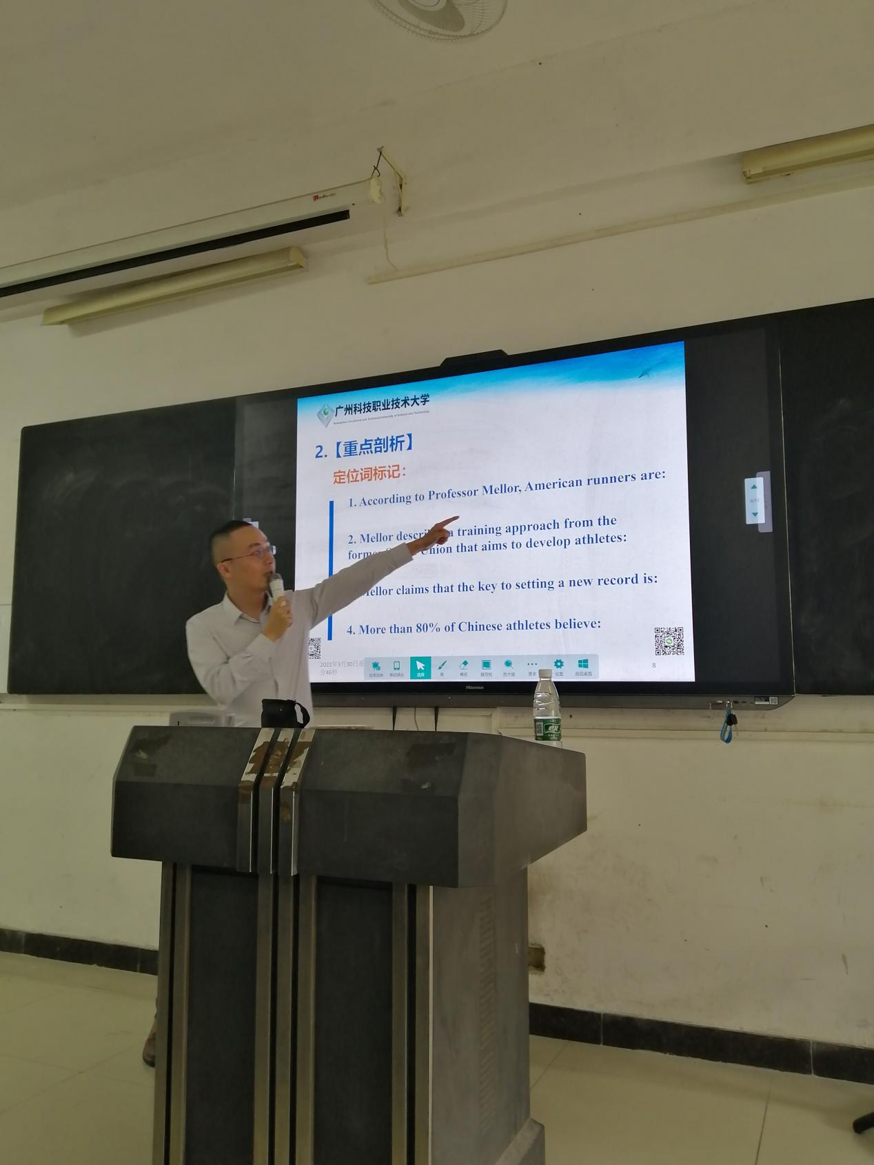 现场竞赛部分首先上场的是田浩霖老师。田老师本科毕业于北京语言大学高级翻译学院,硕士毕业于英国利兹大学商学院,英语口语流利,专业知识过硬。而且有着丰富的社会工作经验,曾在亚太经合组织第三届农业与粮食部长会议担任联络翻译官志愿者,在联合国教科文组织第一届学习型城市大会担任陪同翻译等。田老师首先针对广科大学生的《大学英语四级水平课》做了学情分析:学生自身基础较薄弱,词汇量和阅读速度有限,无法在短时间内提取四级阅读中的相关信息,做题的正确率急需大幅度提升。因此,田老师提出了定位词标记法,即通过勾画题干定位词,在原文中找出对应句子。一些特殊定位词,如数字、人名、地名、专有名词能帮助学生快速在原文中找到对应的答案;如果没有,则可以按照先名词再动词再形容词的顺序,索引对应的句子。田老师随后选取了2020年12月的四级阅读真题,现场展示了如何利用特殊定位词帮学生快速解题。评委都表示:田老师的教学方法新颖、实用,注重学生做题技巧的培养,有助于树立学生自信心,提高学习效果。