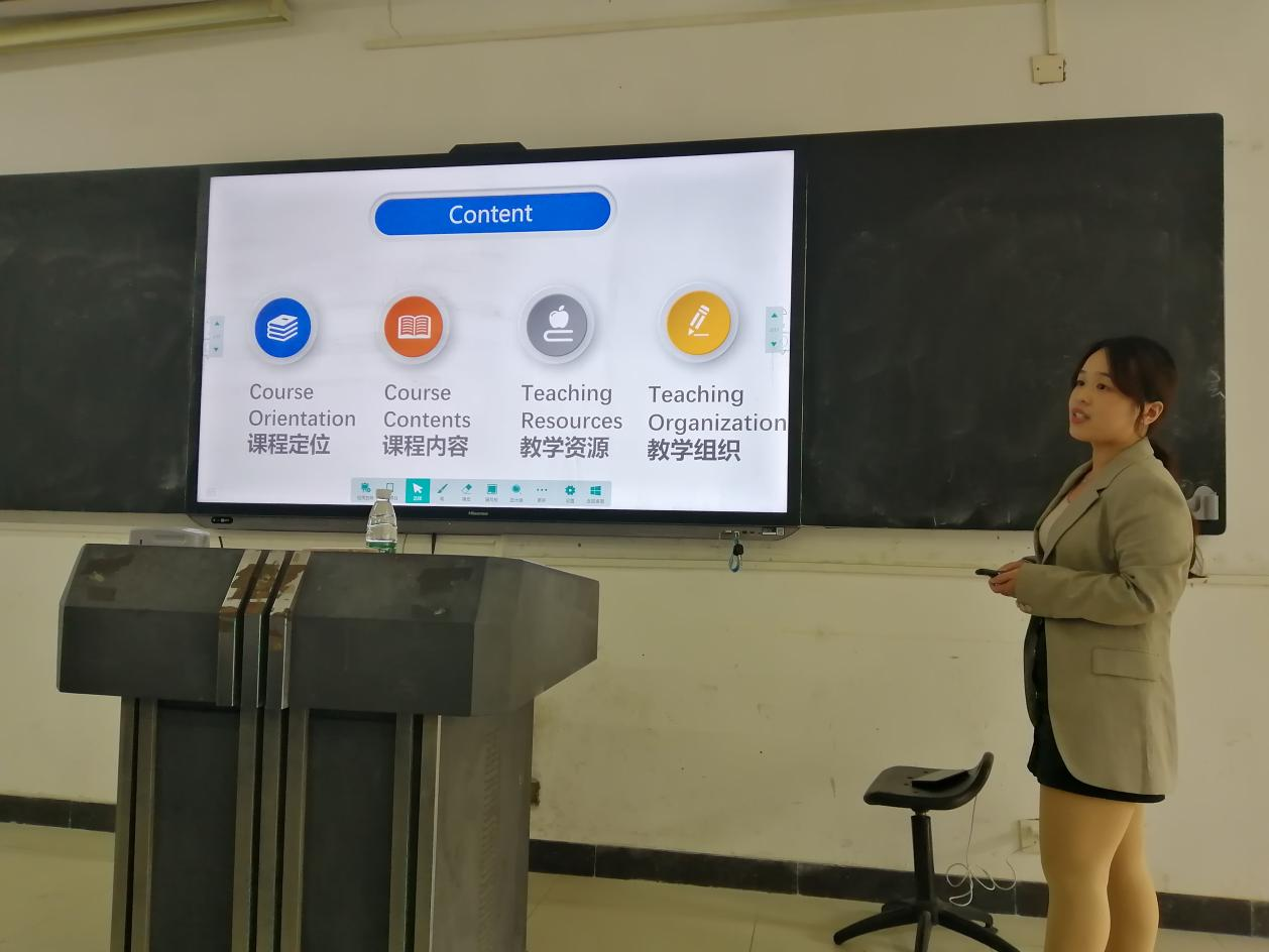 刘舒老师以英语四级考试听力部分为例,全英文介绍了自己的课堂定位、教学目标、教学设计思路等,思路清晰,表达流畅,给评委们展示了一位优秀的教师是如何在有限的课堂时间里导入话题,引导学生做听力答案预测、听力资料分析以及听后练习的。在绝活展示环节,刘老师介绍了自己如何利用构词法帮助学生识记长单词、重点单词。评委们高度评价了刘老师的课堂设计,同时也对刘老师提出建议:课堂可以给学生增加一些技巧性训练,补充时事热点内容,并且注重教学语言的锤炼。