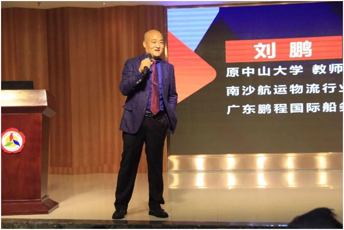 外语外贸学院客座教授、南沙航运物流行业协会刘鹏会长上台致辞。他对此次出席会议的嘉