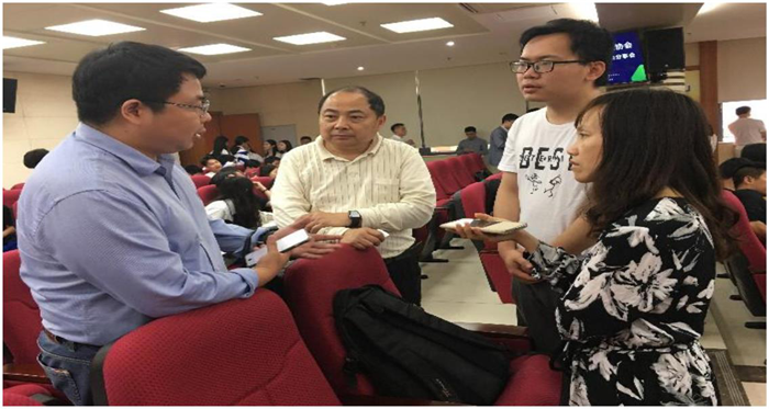 我院参加分享会的老师与到会的深圳凌顺国际物流有限公司总经理刘洪亮先生探讨校企合