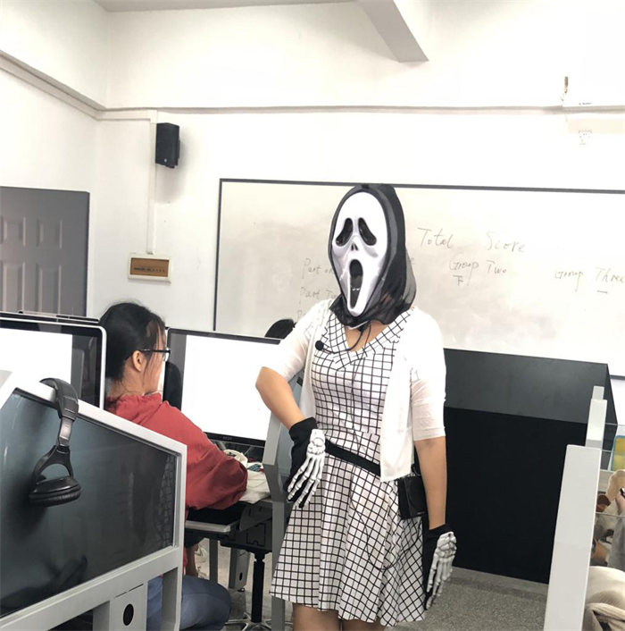 英语学习背景介绍五分钟后,我们期待的英语游戏开始了。Judy老师变魔术般戴上了一个吓人的面具,目的给我们营造了浓浓的万圣节气氛,顿时她把课堂气氛提高到了最高点。