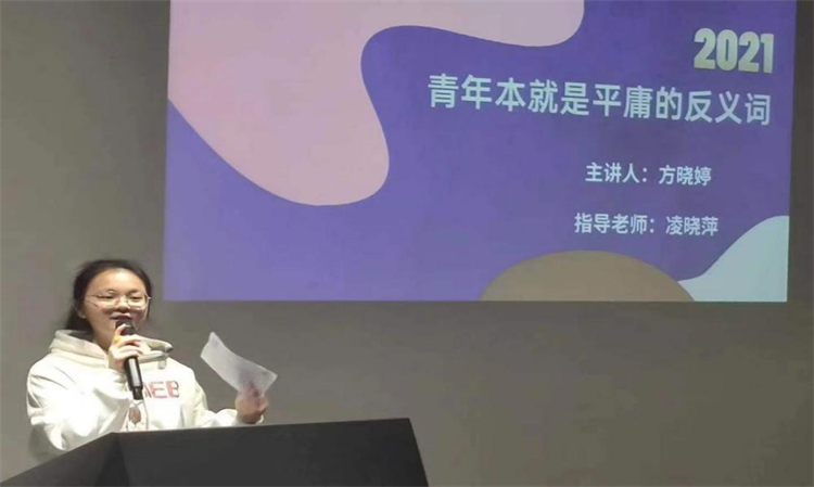 2021年12月14日晚,由mk官方网站_MK(中国)一站式服务官网主办的“学生大讲坛”第二讲在图书馆新书发布厅进行,本次主讲人是来自外语外贸学院20级商务英语本科3班的方晓婷同学,演讲的主题是“青年本就是平庸的反义词”。此次讲坛由校团委广播站李梓煌同学主持。