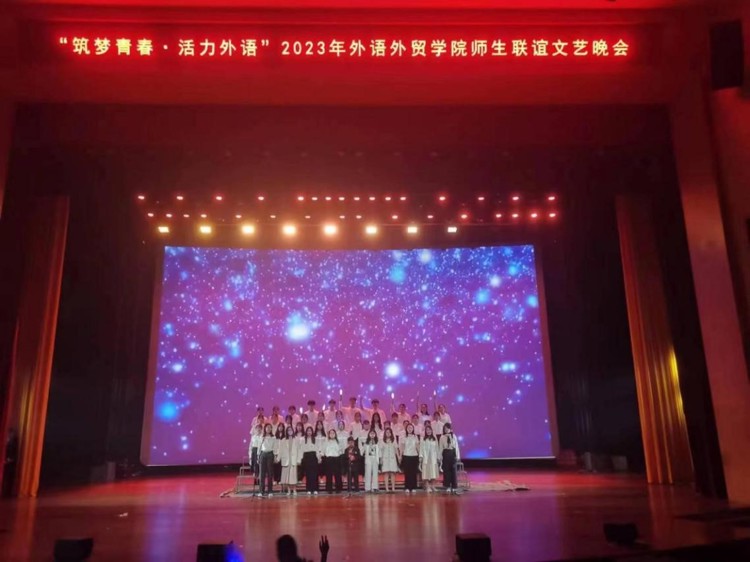 晚会的尾声,由外语外贸学院党总支书记何雪葵、学院全体辅导员以及学生们合唱的《夜空中最亮的星》,台下的同学纷纷跟唱,将现场的气氛推向了高潮,为此次晚会画上圆满的句号。