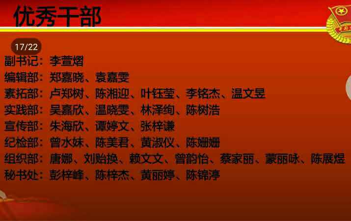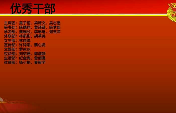 荣获优秀学生干部:积极辅助老师、积极参加学校社团活动。