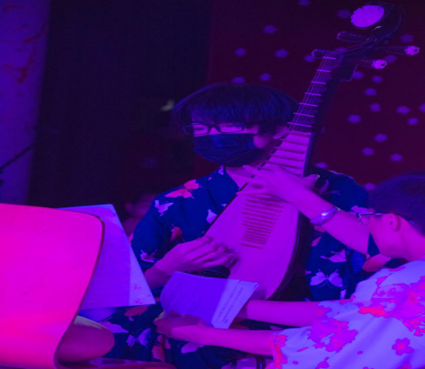 2016级商务日语班的李润昌面带口罩,之间弹奏出悦耳的琵琶声牵动着观众的心弦。令人回忆起古代诗人白居易的《琵琶行》中“千呼万唤始出来,犹抱琵琶半遮面”的场景。