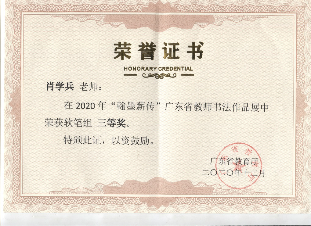 喜报我院肖学兵老师荣获广东省教育厅2020年“翰墨薪传”全省教师书法作品展三等奖